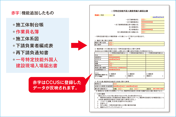 安全書類出力機能に、元請として必要な「一号特定技能外国人建設現場入場届出書」の出力と、「作業員名簿」への業務区分※データ反映を追加しました。なお、CCUSの次期システムでは、国交省の外国人就労管理システムとのAPI連携を予定しています。