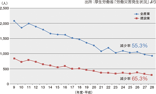 図1 過去20年間の死亡災害発生状況(全産業、建設業)