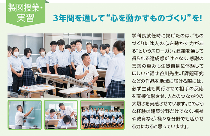 「建築科といっても、入学する生徒すべてが建築志望というわけではなく、保育や福祉、看護の道に進む生徒もいます。しかし、ものづくりを通じて学ぶことは、どのような進路にもつながる普遍的なもの。たとえばコミュニケーション力や協調性、責任感、計画性など、ものづくりという分野を通じて、そうした力を身につけてくれていると感じます」。