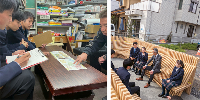 市役所や建築家、地域住民と意見を交わしながら、居心地の良い滞留空間の創出を図ったパークレット『本町ネクスト』。「地域と交流を重ねる中で新たな情報や気づきを得て、それがまた新たな課題の発見にもつながるなど、地域との関わりを起点として発展した取り組みです。多面的なものの見方を育むなど、生徒にとっても貴重な成長のきっかけとなりました」。