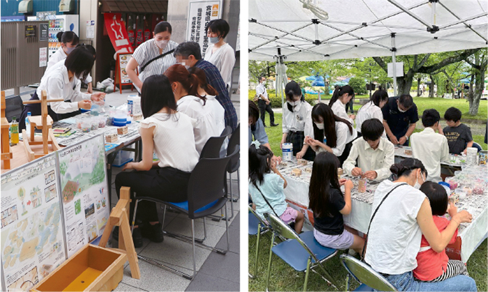 環境イベントSDGsマルシェや地元のお祭りではブースを設け、廃棄木材を再利用した卓上カレンダーやオリジナルキーホルダーの製作体験、こどもたちの作品展示などを実施。こどもたちは来場者と対話しながら“人に伝える力”を磨いている。「こどもたちがいきいきと取り組みながら成長でき、訪れる人たちもみんな笑顔になれる。そんな活動を次代につないでいくことが大切だと実感しています」と萱沼先生。