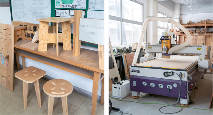 精密加工や複雑なデザインを可能にするCNC加工機などを導入。設計と加工がつながる入口が増えた。「従来よりもすばやく正確に、かつ、今までなら難しかったデザイン性の高い加工なども可能になったことで、生徒も楽しみながら木工に関われています。こうした機器をよりよく生徒に体験させられるよう、私たち教員側もしっかりと知識を身につけていく必要があります」と阿部先生。