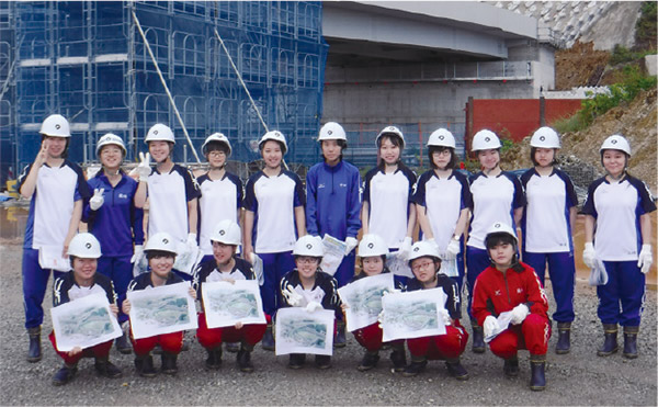 和歌山県地域連携ネットワーク協議会では、取り組みの一つとして、西日本高速道路株式会社の協力により、9月8日(土)、和歌山信愛高等学校の1・2年生の生徒(18名)を対象とした建設現場(2箇所)の見学会を開催しました。はじめに、和歌山市東部コミュニティーセンターにて和歌山南スマートインターチェンジ(仮称)建設現場の説明をうけた後、実際の現場を見学しました。その後2つめの現場へ移動し、新吉礼トンネル(仮称)建設現場を見学しました。普段立ち入ることのできない建設現場を見て、女子高生たちは興味津々の様子でした。
