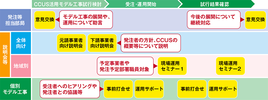 - ●公共発注者の求めに応じて、CCUS活用モデル工事単体だけではなく、自らの要領等を運用するにあたっての助言や、職員・事業者への説明・講習など、深く、広くサポートします。