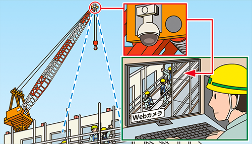 複数のタワークレーンにWebカメラを取り付け、作業中は、常時、作業状況を録画、監視しています(外部の専門業者による)。不安全行動をみつければ、即座に関係者に通知されます。