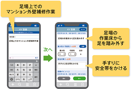 ただ、どうしても1人で行う作業もあるのが実情です。こうした現場では、スマートフォンで個々に危険の洗い出しを可能にする、1人KYアプリがあります。例えば、自らの本日の作業を入力すると、あらゆる危険を想定し示すなどのサポートメニューがあります。また、スマートフォンでは、自分の現場に潜む危険情報を見ることができるシステムもあります。担当の工事を選択すると入場日と時刻が自動で入力され、事前にKY情報が確認できます。