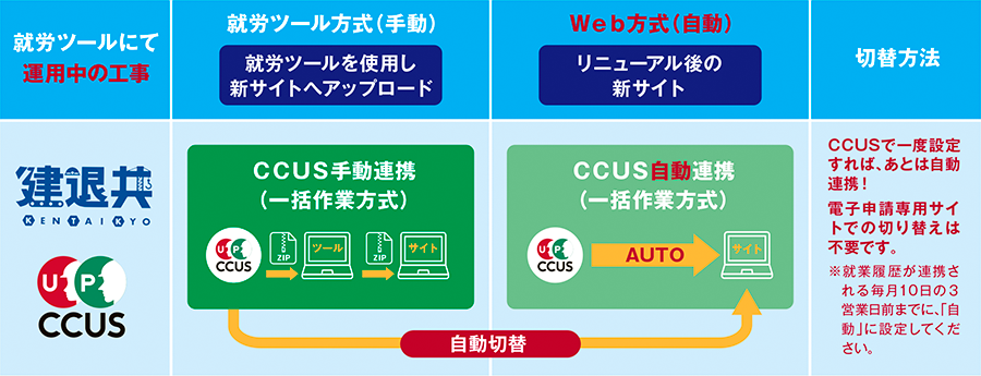 • ● 2025年の10月からは、建退共の電子申請専用サイトのリニューアルにより、一括作業方式(元請事業者又は一次事業者が行う)については、CCUSでの連携設定で自動でデータ連携することが可能になりましたが、新規に運用する工事現場が対象で、既に運用している工事現場については、手動連携のままとなっていました。