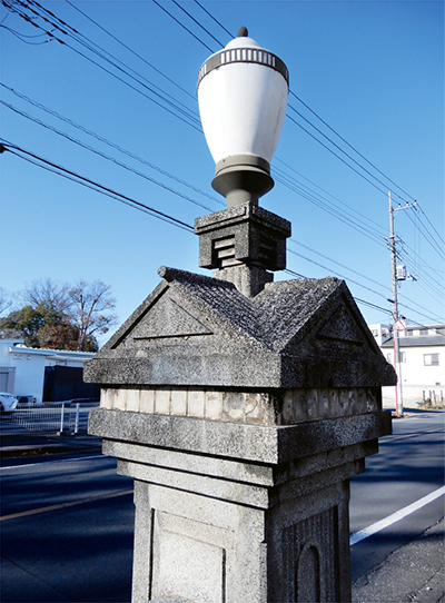 端正な四角柱の親柱4本に、それぞれ小さな屋根が載っている。よく見るとこの屋根、不思議な形状だ。切妻が直角に交差したようなこのスタイル、神社などに見られる「乗り越し屋根」に近いかもしれない。直交する棟の中心から、照明塔が立ち上がっている。ランプシェードはゴブレット(脚付き杯)型だ。高欄には小さなアーチが並び、白いタイルで縁取られている。うーん、おしゃれ。