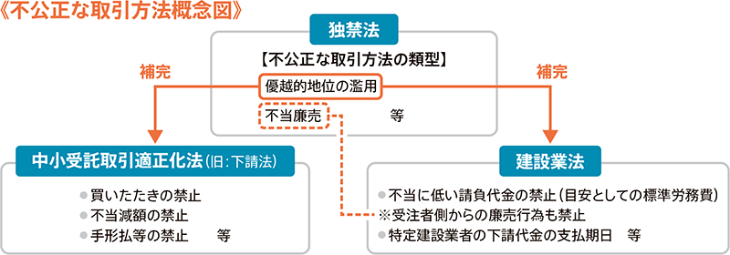 建設業法は、下請保護の役割をもつ独占禁止法(以下「独禁法」)の建設工事請負契約における特別法との位置づけも有しており、注文者(元請を含む)が取引上の地位を利用して、例えば労務費の上昇分を反映しない価格を一方的に押し付けるなどの優越的地位の濫用(独禁法第2条第9項第5号)について建設業における違反を取り締まる規制法(不当に低い請負代金の禁止)としての役割を果たしてきました。