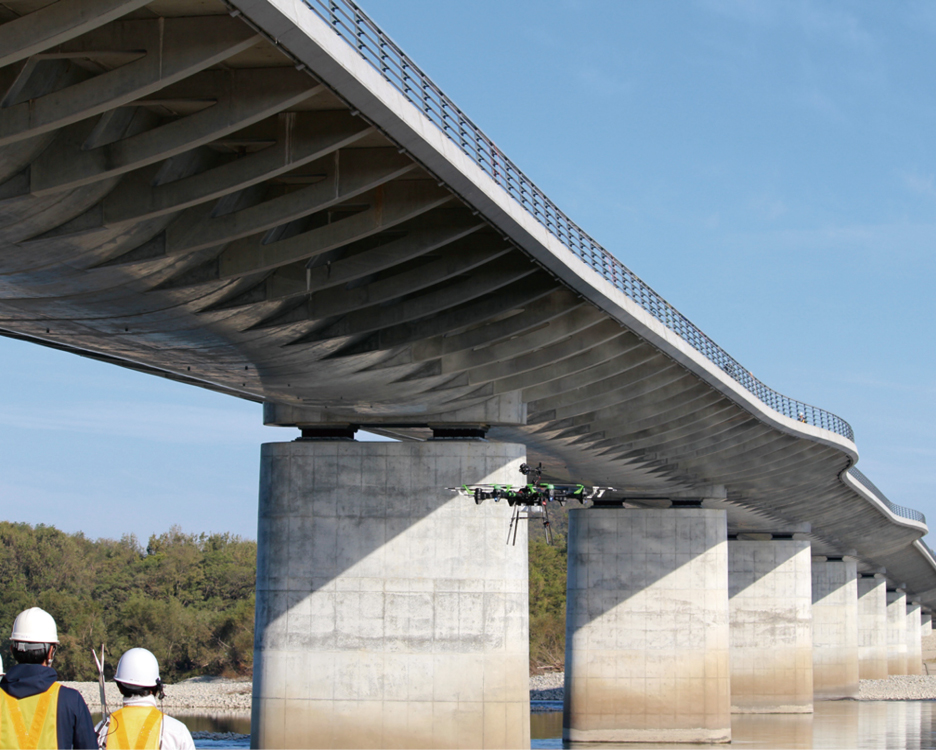ここではまず、これまでに点検でロボットを試験的に導入した事例から、その効果などを見ていく。例えば、全国で初めて定期点検にロボット技術を本格活用した各務原大橋。岐阜県内に架かる同橋は、2013年に完成した橋長594mのプレストレスト・コンクリート10経間連続フィンバック橋だ。
