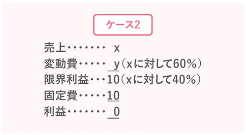 損益分岐点は利益も損失も発生しない点ですので、利益が0となっている状況であり、A社の場合には限界利益が10となっているはずです(ケース2)。
